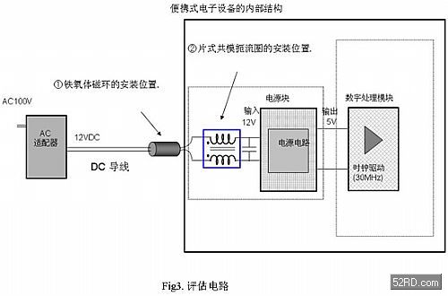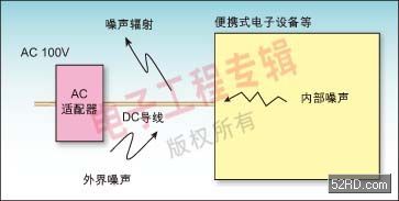 一般說來,便攜式電子設(shè)備內(nèi)部的噪聲是通過DC電源線以共模的方式輸出的,像在AC適配器導(dǎo)線上,其噪聲可以用共模噪聲濾波器進行有效抑制。