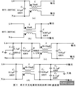為減小體積、降低成本,單片開關電源一般采用簡易式單級EMI濾波器,典型電路如圖3所示