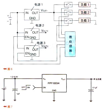 在實(shí)際應(yīng)用中,往往由于電路復(fù)雜而采用電源管理IC及多個(gè)負(fù)載開(kāi)關(guān)組成的負(fù)載管理系統(tǒng),如圖6所示。圖6中有3個(gè)電源,輸出不同的電壓。電源1給負(fù)載1~3供電。為了控制負(fù)載1~3的通電或失電,在電源與負(fù)載之間設(shè)了3個(gè)負(fù)載開(kāi)關(guān)。電源2、電源3則由電源管理IC來(lái)控制其負(fù)載的通電或失電。