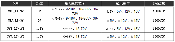 WRB_LT-3W、WRA_LT-3W系列專為采用低輸入電壓電源的情況而設計,可接受低至4.5V-9V的輸入電壓;PWB_LT-1W5、PWA_LT-1W5可滿足超寬4:1輸入范圍的要求; -40℃~+85℃的寬溫度工作范圍保證產品能夠適應多種環境條件的使用;產品具體電氣特性如下表: