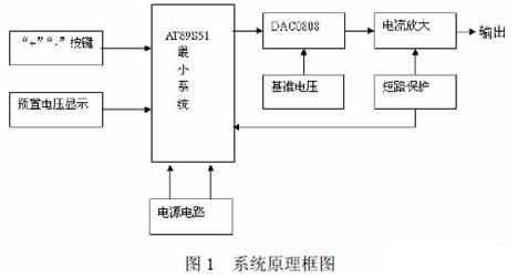 本系統是以AT89S51 單片機為核心控制器,具有電壓可預置、可步進調整、輸出的電 壓信號和預置的電壓信號可同時顯示的數控直流電源,其硬件原理方框圖如圖1 所示。系統 由AT889S51 控制電路、鍵盤電路、電源電路、D/A 電路、功放電路、短路保護及報警電路、 穩壓輸出電路、LED 顯示電路八部分組成。系統通過“開關”、“+”、“-”三個按鍵來控制預置電壓的升降,并通過數碼管顯示。AT89S51 單片機送出相應的數字信號,在D/A 轉換之 后輸出電流,經集成運放LM358 轉換、三極管放大、RC 網絡濾波,最終穩定。同時由LED 數碼管顯示輸出電壓;由數字電壓表測量實測值。