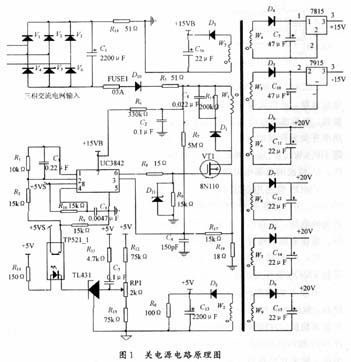 +15V電源和-15V電源對(duì)控制電路電源精度要求較高,但因?yàn)楣灿猛粋€(gè)變壓器很難通過(guò)PWM實(shí)現(xiàn)反饋控制來(lái)穩(wěn)壓。為獲得高品質(zhì)的控制電源,應(yīng)用線性穩(wěn)壓芯片7815和7915(如圖1所示)構(gòu)成了復(fù)合式開(kāi)關(guān)穩(wěn)壓電源。為防止輸出在輕載或空載時(shí)的電壓升高,在5 V整流輸出端并聯(lián)一個(gè)100Ω的負(fù)載電阻。
