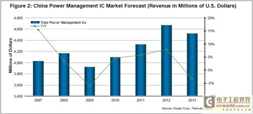 下圖所示為iSuppli公司對(duì)中國PMIC營業(yè)收入的預(yù)測(cè)。