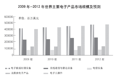未來3年內(nèi),電子數(shù)據(jù)處理設(shè)備、電子元器件、無線通信產(chǎn)品和消費(fèi)類電子產(chǎn)品份額仍將占據(jù)世界電子產(chǎn)品份額的前4位。2009年上述4種電子產(chǎn)品所占比例分別是28.18%、27.99%、16.37%、9.20%。其中電子數(shù)據(jù)處理設(shè)備和消費(fèi)類電子產(chǎn)品所占份額分別比2008年提高了0.77%和0.33%。未來3年內(nèi),世界主要電子產(chǎn)品所占份額的比重基本保持穩(wěn)定,電子元器件所占比重略有增加,預(yù)計(jì)將由2009年的27.99%增加到2012年的28.89%,電子數(shù)據(jù)處理設(shè)備將由28.18%增加到28.43%。