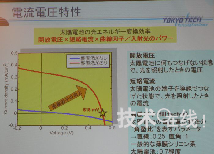 FF值較之前小長井研究小組的0.25有大幅提高,如果不考慮短路電流Isc僅為0.338mA/cm2這一點(diǎn),I-V曲線呈現(xiàn)的特性與太陽能電池的特性接近。“Isc較小估計(jì)是因?yàn)殡娏髀┑搅巳〈该麟姌O的n型結(jié)晶硅層上”(黑川)。