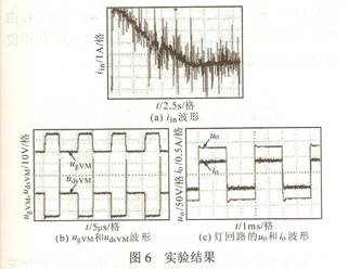 在前述原理分析和實現方案討論的基礎上進行了實驗論證。實驗樣機是額定功率為35W汽車頭燈電子鎮流器。升壓電路采用反激式電路,選用UC3843作為PWM控制芯片。主要電路參數有:反激式電路的MOSFET開關管選用的IRF540;二極管選用MUR860,變壓器的初級電感Lp=7.8µH,輸出電容選擇耐壓為630V的1µF的CBB電容。圖6b示出反激式變換器穩態下開關管的驅動電壓UgVM和開關管漏源極兩端的電壓UdsVM實驗波形??梢?,UdsVM有一個很大的尖峰,是漏感的能量所致。圖6c示出穩態時兩端的電壓uo及其流過燈的電流io實際工作波形。由圖可見,燈兩端的輸出功率將近達35W,這與理論設計符合得很好。