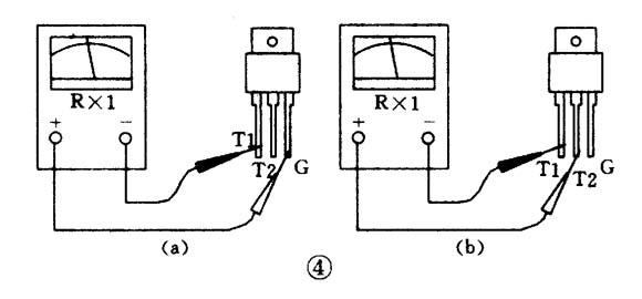 (2)把黑表筆接T1極,紅表筆接T2極,電阻為無窮大。接著用紅表筆尖把T2與G短路,給G極加上負(fù)觸發(fā)信號(hào),電阻值應(yīng)為十歐左右(參見圖4(a)),證明管子已經(jīng)導(dǎo)通,導(dǎo)通方向?yàn)門1一T2。再將紅表筆尖與G極脫開(但仍接T2),若電阻值保持不變,證明管子在觸發(fā)之后能維持導(dǎo)通狀態(tài)(見圖4(b))。