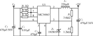 如果保證在最低輸入電壓70%Rn時電表能輸出正常的工作電壓,按線性變壓器特性,則在額定輸入電壓Un時,輸出電壓會較高,如果輸出電壓整流濾波后采用一般的線性穩(wěn)壓器供電,將會使整機功耗加大;而在最高輸入電壓時,將會使變壓器溫升增大,線性穩(wěn)壓電路損耗加大,發(fā)熱量也會增大;針對整機耗電較大的電子電度表,其解決辦法一是可以采用較好材質(zhì)的硅鋼片,如Z11型硅鋼片;二是低壓輸出穩(wěn)壓電路采用一個低成本的高效率DC/DC變換電路,即可使整機功耗顯著降低,還可在寬輸入電壓范圍內(nèi),穩(wěn)定、高效地工作。這些DC/DC電路可以采用簡單的低成本MC34063、LM2574等DC/DC變換器,采用MC34063設計的+5V輸出DC/DC變換器如圖3所示。