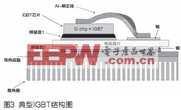 圖3顯示了帶基板的功率模塊的結(jié)構(gòu)。兩側(cè)都帶薄銅層的陶瓷襯底被焊接在基板上。IGBT芯片被焊在設(shè)計(jì)好的銅層上。芯片的表面通過(guò)綁定線(xiàn)(bondingwire)壓焊到銅層上。大多數(shù)標(biāo)準(zhǔn)模塊采用這種制作方法。目前70%到80%的功率模塊都按照標(biāo)準(zhǔn)模塊結(jié)構(gòu)來(lái)制造。陶瓷一般采用Al2O3,基板采用銅為材料。IGBT底板通過(guò)導(dǎo)熱硅脂安裝散熱器。