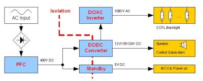 DC/AC逆變電源用于驅(qū)動背光模組,其將DC/DC主電源輸出的24V或12V直流電壓轉(zhuǎn)換為1000V左右的高壓交流電壓用于驅(qū)動背光CCFL燈管并實現(xiàn)背光亮度(燈管電流)的調(diào)節(jié)功能,LCDTV顯示畫面的對比度需依靠高亮度的背光來支撐,所以DC/AC逆變電源部分的輸出功率通常占整機總輸出功率的70%以上,且尺寸越大,背光功耗所占比重越大。