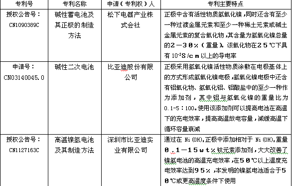 在電池配料時,通過機械混合法添加周期表中ⅡA、ⅢB、ⅣB、ⅦB、ⅧB、ⅡB主族元素和3、4、5周期的元素、氧化物或氫氧化物,能較好地提高或改善鎳氫高溫性能。世界著名電池制造公司在華申請授權的專利中多有介紹,如日本松下、三洋;中國比亞迪;德國H.C.施塔克等公司。詳細見下表: