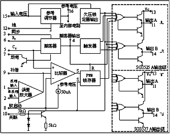 SG3525是美國通用公司的產品,如圖2所示,內部電路主要由基準電源、振蕩器、誤差放大器、PWM比較器與鎖存器、分相器、欠電壓鎖定、輸出級、軟啟動以及關斷電路等組成?;鶞孰娫词且粋€典型的三端穩壓器,精度可達,采用了溫度補償。作為內部電路的供電電源,并可向外輸出40mA電流。振蕩器由一個雙門限比較器,一個恒流源及電容充放電電路組成,在芯片外部由5腳對地接一電容器,6腳對地接一電阻,5腳和7腳之間外接電阻即可構成該振蕩器。