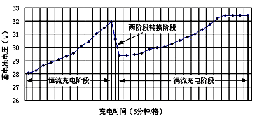 使用該蓄電池充電器對某型號航空蓄電池進行了充電試驗,最大充電電流限制為30A,溫度限制值定為350C。蓄電池的初始電壓為20V,充電開始時,充電器以20A的電流對蓄電池持續充電約58分鐘,然后以較小的電流3A對蓄電池進行涓流充電,直至蓄電池電壓上升到32.45V時,蓄電池兩端的電壓不再發生明顯的上升現象,此時充電器停止充電,歷時150分鐘,充電過程曲線示意圖如圖6所示。