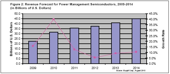 從2009年到2014年,功率MOSFET的復(fù)合年度增長率將為20.8%,高于任何類型的電源管理半導(dǎo)體,不論是分立還是集成類型。