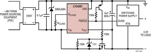 圖1b:采用LTC4257實現的符合基本802.3af標準的PD電路。