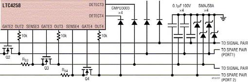 圖1a:采用LTC4258實現的符合基本802.3af標準的PSE電路