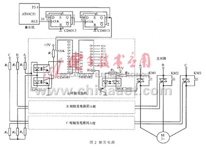 晶閘管觸發信號的產生:在每1相都串入光耦TLP521,以A相為例,2個光電耦合器TLP521按圖2所示接入。另一光電耦合器MOC3020的輸出1個腳接主回路A相雙向晶閘管的1個陽極,另一腳接觸發極。光耦TLP521和MOC3020都起到了控制回路與主回路相隔離的作用。計數器CD4040是12位計數器,將其Q5~Q12輸出端與74HC682輸入端P0~P7相連。A相電壓在1個周期有2個過零點,過零時2個光耦內部的發光二極管均不導通,CD4040的RST端為高電平,CD4040清零并開始計數,計數頻率由其時鐘端(CLK)輸入脈沖控制(來自四分頻器),由程序傳送給單片機的P2口1個設定數,P2口與74HC682的Q0~Q7端相連。74HC682是數值比較器,當由P0~P7組成的二進制數大于由Q0~Q7組成的二進制數時,其P>Q非端輸出低電平,光耦MOC3020導通,晶閘管的觸發回路便有觸發電流通過,雙向晶閘管導通。該觸發電路沒有采用傳統的觸發脈沖調制放大電路,設計和實施上更為簡單。
