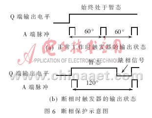 斷相是對電動機危害較大的一種故障,為此系統單獨設置了如圖5所示的斷相保護電路,主要由摩托羅拉單穩態觸發器MC14548和3只二極管組成的“或門”電路實現。斷相保護示意圖如圖6所示。MC14548由上升沿觸發,產生1個脈寬由外加定時元件電阻R1和電容C決定的輸出脈沖。當MC14548的A端出現1個上升沿、B端為高電平時,Q端(平時輸出低電平)輸出1個由低到高的脈沖,經過時間τ(τ=R1×C)后從高變低。分別來自A、B、C相觸發電路中計數器CD4040的RST端的3個信號經“或門”電路與MC14548的A端相連。因三相電源電壓相位互差120°,故接入A、B、C三相回路的3個雙光耦TLP521每60°就有1次過零,過零時3個計數器CD4040的RST端一定有1個呈高電平,經過“或門”后MC14548的4腳每60°就有1個上升沿脈沖。若設定時間常數τ的值在大于60°而小于120°所對應的時間為:3.3ms<τ<6.6ms,則不缺相時,單穩態觸發器將始終處于暫態,MC14548的Q端始終輸出高電平,此時觸發器的工作狀態如圖6(a)所示;若斷相,MC14548的A端將出現隔120°才出現下一個脈沖的情況,此時MC14548的Q端將從暫態回到穩態,呈現低電平,此時觸發器的工作狀態如圖6(b)所示。將MC14548的Q端連至單片機的P3.0端口,由程序檢查P3.0端口,如為零則說明斷相,然后進行斷相處理。
