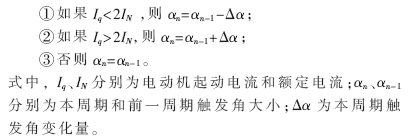 (3)軟起動模塊:根據電動機電流檢測信號,經單片機分析和處理后得到當前晶閘管觸發角的大小,以實現電機的限流起動。以起動電流限定為2倍的額定電流為例,觸發角控制算法如下: