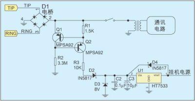 在掛機(jī)狀態(tài)下有多種饋電方式,恒流源配合線性穩(wěn)壓電路的饋電方式是常用的一種,圖1給出了這種饋電方式的電路結(jié)構(gòu)。在該電路中,電橋用來(lái)做極性保護(hù),其后的一個(gè)恒流源電路與通訊電路并接。電流大小基本由R1決定,約為300uA,這是為了在保證掛機(jī)電源供應(yīng)的同時(shí),不會(huì)因?yàn)槁╇娺^(guò)大而導(dǎo)致交換機(jī)方誤判電話終端故障。由于電流太小,所以無(wú)法使用效率更高的開(kāi)關(guān)電源。通訊電路一般采用變壓器耦合以消除對(duì)地的不平衡,但如果電路允許,也可采用通訊電路與電橋共地的連接方式來(lái)簡(jiǎn)化電路。