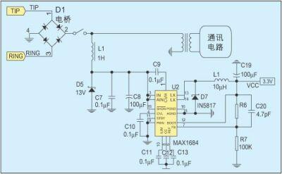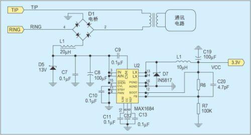 摘機(jī)饋電電路大致分為兩類,饋電電路與通訊電路并聯(lián)的屬于并聯(lián)饋電,饋電電路與通訊電路串聯(lián)的屬于串聯(lián)饋電。圖2是一種常用的并聯(lián)饋電電路,大電感L1保證直流饋電不會(huì)影響交流信號(hào)。對(duì)于惡劣的線路狀況,如5km長(zhǎng)的用戶線路,若不考慮通訊電路的影響,齊納管D5上的電壓最大為15V,功率可達(dá)340mW。當(dāng)線路狀況更加惡劣時(shí),將齊納管D5上的電壓降低到13V,則可獲得300mW左右的功率。利用MAXIM公司的開(kāi)關(guān)頻率為600KHz,效率可達(dá)95%的高效DC/DC轉(zhuǎn)換器MAX1685,將這個(gè)電壓轉(zhuǎn)換成3.3V就可獲得85mA的電源電流。