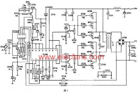 圖1為汽車音響開關(guān)電源電路,該電路主要由兩片集成電路TL494和KIA358、驅(qū)動管Q702和Q703、開關(guān)管M704~M709、變壓器、輸出整流器和濾波器等組成。TL494是一個脈寬調(diào)制型開關(guān)電源集成控制器,其最大驅(qū)動電流為250mA,工作頻率為1~300kHz,輸出方式可選推挽或單端形式。內(nèi)部方框圖如圖2所示,詳細(xì)資料參考TL494脈寬調(diào)制控制電路。它主要由一個三角波振蕩器、兩個比較器CMP1和CMP2、兩個誤差放大器A1和A2、5V基準(zhǔn)電壓源、觸發(fā)器及輸出驅(qū)動器等組成。