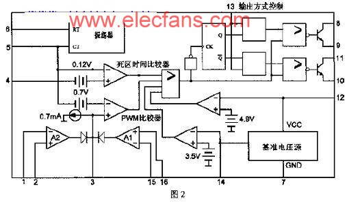 死區(qū)時間由4腳電壓來設(shè)定,范圍為0~3.3V之間。誤差放大器A1作為輸出電壓取樣誤差放大,結(jié)果通過PWM比較器控制脈寬使輸出電壓穩(wěn)定。誤差放大器A2作為保護(hù)控制用,15腳接參考電壓5V(由14腳提供),16腳為控制輸入。在開機(jī)保護(hù)、過溫或過流保護(hù)時,16腳為高電平,這時,誤差放大器A2輸出高電平,該電平高于振蕩器三角波電平幅值,而使驅(qū)動器沒有驅(qū)動脈沖輸出,負(fù)載安全停電。