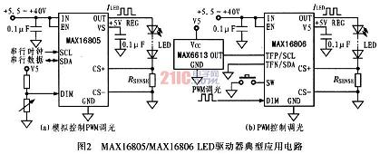 由于很多照明系統沒有可利用的微控制器產生PWM調光信號,因此可采用MAXl6805/MAXl6806型LED驅動器。這兩款器件均由內部產生PWM信號,PWM信號由加在DIM輸入引腳的外部模擬電壓設置。不采用模擬調光時,MAXl6806有一個開關輸入(SW),該開關輸入不僅檢測開關狀態,并具有去抖功能,為開關提供濕電流。圖2為MAXl6805/MAXl6806典型應用電路。