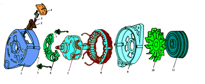 交流發電機一般由轉子、定子、整流器、端蓋四部分組成。