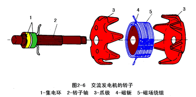 轉子軸上壓裝著兩塊爪極,兩塊爪極各有六個鳥嘴形磁極,爪極空腔內裝有磁場繞組(轉子線圈)和磁軛。集電環由兩個彼此絕緣的銅環組成,集電環壓裝在轉子軸上并與軸絕緣,兩個集電環分別與磁場繞組的兩端相連。
