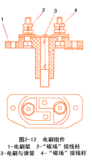 后端蓋上裝有電刷組件,有電刷、電刷架和電刷彈簧組成。電刷的作用是將電源通過集電環引入磁場繞組。見圖2-12