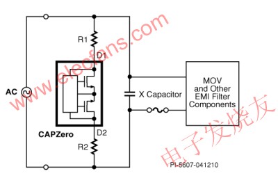 要想實(shí)現(xiàn)待機(jī)電流接近零的目標(biāo),就必須找到能消除R1和R2連續(xù)電流消耗的解決方案。PowerIntegrations新推出的CAPZeroIC可以輕松實(shí)現(xiàn)這一點(diǎn)。圖2所示為CAPZero在典型應(yīng)用中的使用情況。