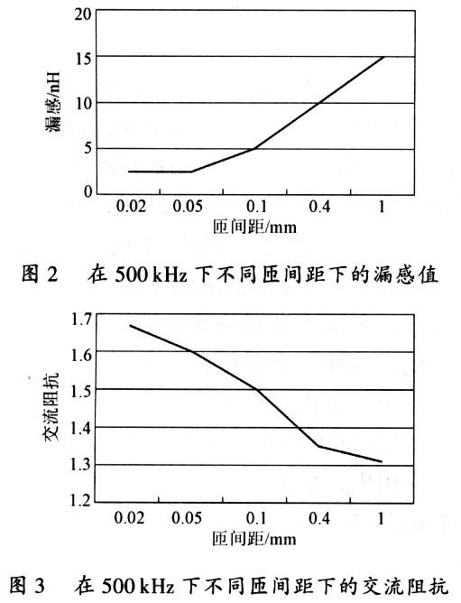 圖2與圖3給出了在不同的間隙下漏感和交流阻抗的變化,可以明顯地看出間隙越大,漏感越大,交流阻抗越小。在間隙增加1mm的狀況下漏感值增加了5倍之多。因此,在滿足電氣絕緣的情況下,應(yīng)該選用最薄的絕緣體來(lái)獲得最小的漏感值。