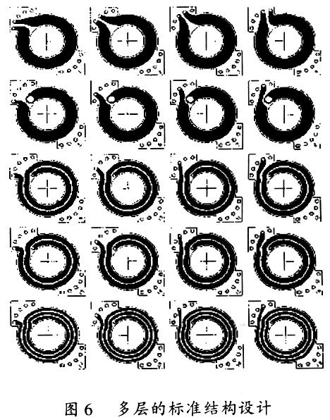 在雙面PCB板的每一層都是由一到多匝的繞組組成的,而且所有的層都保持著一樣的物理特性:即相同的形狀和相同的外部連接點(diǎn)。在有些多匝的層次中,這個(gè)外部連接點(diǎn)是不同匝數(shù)間的電氣連接點(diǎn)。如果有些層只有一匝,它也可以被印制在PCB的雙面來(lái)降低交流阻抗。使用銅箔直接印制在PCB板上來(lái)替代傳統(tǒng)的導(dǎo)線,即使在許多需要很多匝數(shù)的開關(guān)電源中,變壓器依舊能保持一個(gè)很小的體積,這便大大減小了整機(jī)的體積。具體的設(shè)計(jì)步奏和注意事項(xiàng)請(qǐng)參閱文獻(xiàn)[3]。圖6顯示了一個(gè)頂層的標(biāo)準(zhǔn)匝數(shù)設(shè)計(jì)的例子,它使用的是罐形(RM)磁芯。
