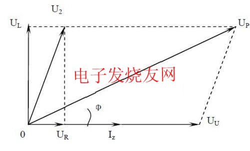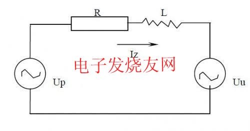 光伏發(fā)電并網(wǎng)運行時的電路原理如圖2所示。Up為逆變器輸出電壓,Uu為電網(wǎng)電壓,R為線路電阻,L為串聯(lián)電抗器,Iz則為回饋電網(wǎng)的電流。為保證回饋功率因數(shù)為1,回饋電流的相位必須與電網(wǎng)電壓的相位一致。以電網(wǎng)電壓Uu為參考,則Iz與Uu同相位,其矢量圖如圖3所示。內(nèi)阻R兩端的電壓UR與電網(wǎng)電壓相位一致,而電抗器兩端電壓UL的相位則落后于UR90º.由此可以求得UP的相位和幅值: