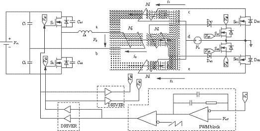 在上面提出的這些IM-CDR拓撲中都存在同一個問題,就是它們的輸出濾波電感值受到了限制,所以,存在相對較大的輸出電流/電壓紋波。因此,SunJian提出了如圖1(f)所示的電路。從結構上與圖1(e)相比較,只是在中心的磁柱上加了一組繞組,并串在了輸出端,這就相當于在輸出端多加了一個濾波電感,從而減小了輸出電流和電壓紋波[4]。但這種結構拓撲并不適合低壓大電流場合。