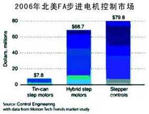 步進運動市場的總體規模,包括商業和汽車行業是相當大的。據motiontechtrends(mtt)最新的市場研究,核心工業部門,工廠自動化(fa),代表了一個相對小的但是穩固的市場,2006年在北美,步進電機和控制消費大約為156萬美元。fa市場包括機床,機器人系統,各種oem的生產機器(包括半導體設備、印刷、紡織、塑膠等)。據mtt粗略估計,歐洲和日本分別占步進電機市場的15%和50%,高于美國。