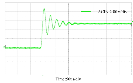 而在適配器熱插拔時,也會出現瞬態的過壓電壓,由于適配器連接線的寄生電感效應,熱插拔時會產生瞬態的輸出振蕩波形,經過一段時間的衰減后會穩定在DC值。圖2為5.5V適配器熱插拔時的瞬態波形,通常適配器熱插拔時產生的瞬態過壓峰值電壓是其DC值的兩倍左右。