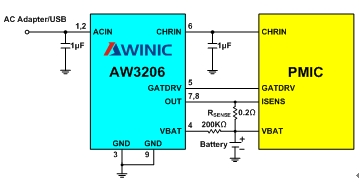 AW3206和AW3208的輸入引腳ACIN到地需要一個不小于1uF的輸入電容。這個輸入電容除了去耦外,還可以有效減小適配器在熱插拔時由于連接線的寄生電感效應產生的瞬態過沖電壓。另外這個電容建議選取耐壓不低于15V的X7R或X5R陶瓷電容。
