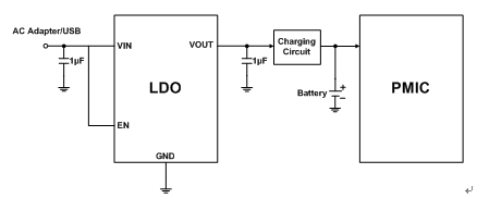 但在標準的諾基亞適配器中,有很大一部分適配器的輸出電壓是高于7V的,圖3是諾基亞適配器AC-3C的輸出特性曲線,從圖中可以看出,AC-3C的輸出電壓在空載時為7.5V,而有的諾基亞充電器的輸出電壓會高達8~9V。為了適應諾基亞適配器,曾有如圖5所示的用高壓LDO設計的手機充電系統方案: