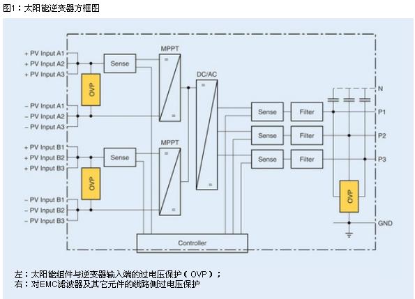 太陽能裝置通常裝在屋頂等戶外位置,也越來越多地裝在開闊地帶,因而過電壓帶來的風險極高,而太陽能組件與逆變器(直流電平)之間長長的引線以及接至電網(交流電平)的饋線則又加劇了這一風險。圖1為典型太陽能逆變器的結構:將來自太陽能組件的直流電壓轉換成交流電壓,然后供給電網。