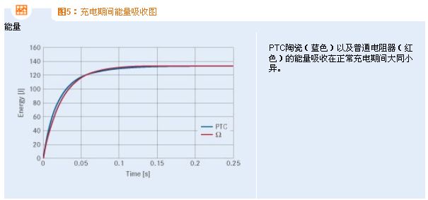 在短時間內,并聯的兩個自我防護式充電電阻器與外界達到熱平衡,同時由于PTC陶瓷的高電阻值,吸收的能量僅有略微上升。最終產生的能量吸收與圖7所示類似。
