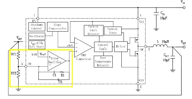 對(duì)于不同廠商設(shè)計(jì)的Buck變換器芯片,外圍電路所需要的器件會(huì)有所不同,這是因?yàn)樾酒募啥扔胁町悾热纾械膹S商會(huì)把功率管集成在芯片內(nèi)部;有的廠商會(huì)把控制部分的補(bǔ)償網(wǎng)絡(luò)集成在芯片內(nèi)部。集成度越高的芯片,外圍電路所需要的器件就越少,因此對(duì)于客戶來說,外圍器件的選擇需要根據(jù)具體芯片來決定。然而,對(duì)于任何一個(gè)輸出可以調(diào)節(jié)的Buck變換器芯片,選擇合適的反饋電阻是必不可少的。圖2是BCD半導(dǎo)體公司的Buck變換器AP3406的典型應(yīng)用圖,由于該芯片集成度很高,外圍只需要輸入電容、輸出電感、輸出電容和反饋電阻,本文就以此為例對(duì)反饋電阻的作用做簡(jiǎn)要分析,為如何選擇反饋電阻提供參考。