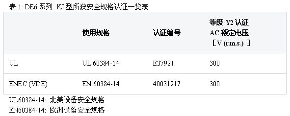要想獲得安全規(guī)格認(rèn)證,需要接受規(guī)定的實(shí)驗(yàn)并滿足要求標(biāo)準(zhǔn),通過合格判定,才能夠證明電容器符合該規(guī)格。但目前,對On-Board(含車載充電器的車載設(shè)備)的安全規(guī)格并無明確規(guī)定。實(shí)際上,車載充電器已經(jīng)參照現(xiàn)有民用設(shè)備的安全規(guī)格,決定了其規(guī)格發(fā)展方向并付諸實(shí)施。因此,該電容器在遵循現(xiàn)有的設(shè)備安全規(guī)格(IEC 60384-4)的基礎(chǔ)上,也獲得了各國的安全規(guī)格認(rèn)證。DE6系列“KJ”型所獲得的安全規(guī)格認(rèn)證如下表1所示。