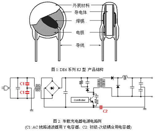 產(chǎn)品線如表2所示,產(chǎn)品結(jié)構(gòu)如圖1所示。產(chǎn)品的容值從100pF到4700pF,另外,額定電壓為AC300V (r.m.s.) 、耐電壓為AC2600V (r.m.s.) /60sec。滿足IEC 60384-14所規(guī)定的實(shí)驗(yàn)條件,通過新樹脂材料的絕緣涂裝,提高了耐溫度循環(huán)特性,能夠成為PHEV以及EV的車載充電器的AC線路濾波器用Y電容器、初級次級耦合用電容器,如圖2所示。