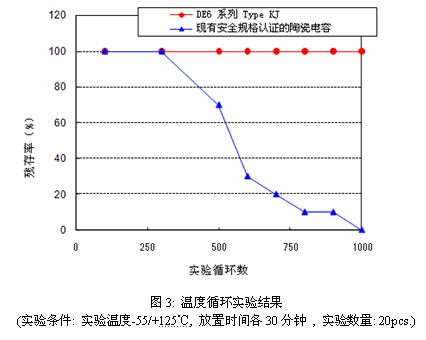 現(xiàn)有安全規(guī)格認(rèn)證的陶瓷電容器在溫度循環(huán)實(shí)驗(yàn)等反復(fù)進(jìn)行溫度變化的條件下,因電容器構(gòu)成材料熱膨脹率的散差,容易引起外部涂裝樹脂的結(jié)合力降低,從而導(dǎo)致外部涂裝樹脂出現(xiàn)裂縫,嚴(yán)重時會由于內(nèi)部陶瓷元器件的裂縫,造成容值及絕緣耐壓值的降低。所以,原樣采用現(xiàn)有結(jié)構(gòu)材料將難以用于車載設(shè)備。因此,為提高耐溫度循環(huán)性,通過選定具備可塑性的新型樹脂材料,就能夠制做出確保溫度循環(huán)1000周期、符合安全規(guī)格認(rèn)證的陶瓷電容器。溫度循環(huán)實(shí)驗(yàn)下的產(chǎn)品特性比較情況如圖3所示。