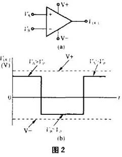 圖2(a)是雙電源(正負電源)供電的比較器。如果它的VA、VB輸入電壓如圖1(b)那樣,它的輸出特性如圖2(b)所示。VB》VA時,Vout輸出飽和負電壓。