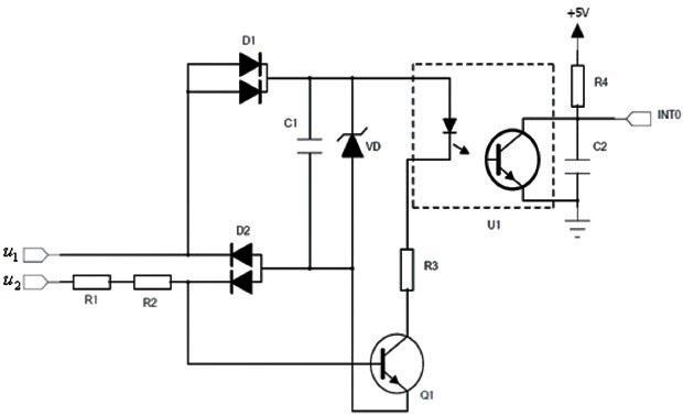 當(dāng)u 1 >u 2 時(shí),穩(wěn)壓管兩端電壓為5V,電容C1充電,由于C1容值較小。而u 1>u 2 的時(shí)間為半個(gè)周期,即0.01s,足以保證電容C1充電完成,此時(shí)并聯(lián)在三極管Q1基射極兩端的的二極管提供鉗位電壓,使得三極管工作在截止區(qū),光耦U1的控制二極管不導(dǎo)通,受控三極管截止,單片機(jī)外部INT0拉至高電平,當(dāng)經(jīng)過a點(diǎn)后,u 2>u 1 ,U2為三極管Q1提供基極電壓,同時(shí)電容C1提供集射極電壓,三極管Q1導(dǎo)通,在這段時(shí)間內(nèi),C1、控制二極管、R3、Q1形成回路,光耦U1中的受控三極管導(dǎo)通,單片機(jī)外部中斷INT0下拉至低電平,在這個(gè)過程中,單片機(jī)對這個(gè)下降沿進(jìn)行捕捉,實(shí)現(xiàn)對u1、u2兩相交點(diǎn)a進(jìn)行檢測,光耦U1實(shí)現(xiàn)了輸入端和輸出端的電氣隔離,同時(shí)提高了系統(tǒng)的抗干擾能力。