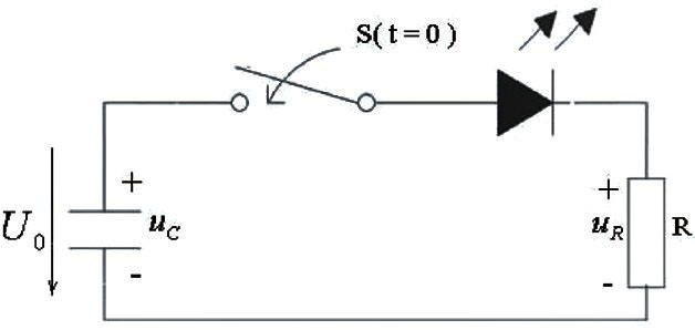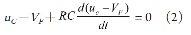 u0為穩(wěn)壓二極管VD的穩(wěn)定電壓,發(fā)光二極管的導(dǎo)通壓降為VF ,t ≥0時(shí)電容儲存的能量通過發(fā)光二極管和電阻釋放出來,在這段時(shí)間內(nèi)發(fā)光二極管發(fā)光,根據(jù)KVL可得: