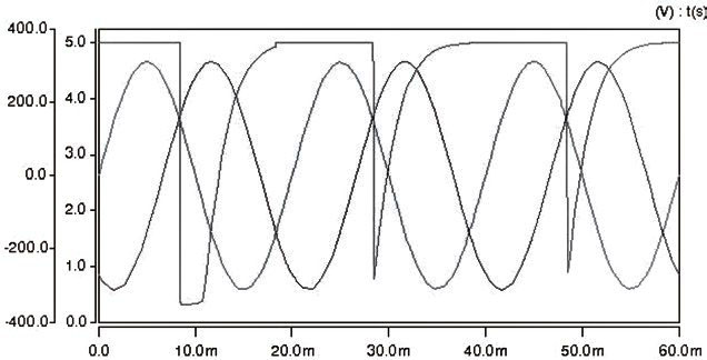 以上設(shè)計(jì)方案在Sabe r環(huán)境下進(jìn)行了仿真驗(yàn)證,仿真結(jié)果如圖5所示,其中兩正弦波為三相電源的其中兩相電壓,脈沖電壓為送至單片機(jī)外部中斷INT0的信號。從圖5可以清晰的看到,在自然換相點(diǎn)附近,產(chǎn)生了一組幅值為5V,脈寬約為2ms,頻率為50Hz的脈沖信號,而在自然換相點(diǎn)處,產(chǎn)生了一個(gè)近乎90度的下降沿,有利于單片機(jī)進(jìn)行捕捉。改變時(shí)間常數(shù)τ可以改變脈沖電壓的脈寬,如圖5所示,在自然換相點(diǎn)處產(chǎn)生了一組幅值為5V,脈寬約為10mS,頻率為50Hz的脈沖信號。 圖5 為經(jīng)檢測電路得到的脈沖電壓,圖6為不同τ值檢測電路得到的脈沖電壓。